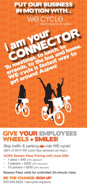 Ride WE-cycle for FREE. Sign up at www.we-cycle.org or on the app, Transit, for access to unlimited rides of 30 minutes or less. Once signed up, you can ride in the Aspen, Mid-Valley, and Snowmass Village Systems and experience the freedom and convenience of bikeshare. More information at 970.205.9222.